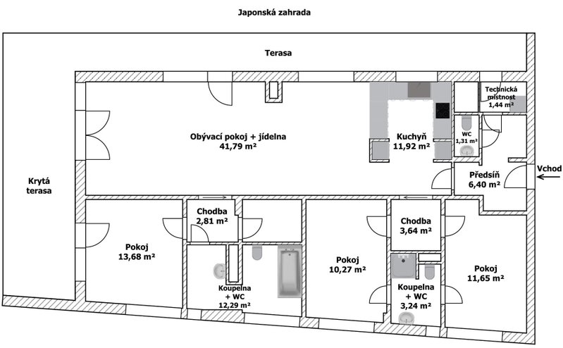 Obývací pokoj s jídelním koutem a se vstupem na krytou terasu s upravenou zahradou. Kompletně zařízená kuchyň včetně všech spotřebičů. Nájemník ocení tři samostatné neprůchozí ložnice, z nichž hlavní ložnice je s vlastní koupelnou a samostatnou prostornou šatnou. Komfort zajišťují 2 koupelny, z nichž jedna s vanou a druhá se sprchovým koutem a toaletou, samostatná toaleta při vstupu do bytu. Technická místnost s pračkou a sušičkou se vstupem na terasu. Elektricky ovládané předokenní žaluzie v celém bytě zajišťují soukromí a pohodlí. Bezpečnostní systém (alarm) v celém bytě. Byt je částečně vybavený s možností zcela dovybavit lůžky a psacími stoly po dohodě. Byt je vhodný pro rodinu s dětmi, komfortně a moderně vybaven. Praktické vestavěné skříně v ložnicích, šatně i předsíni. V bytě je klimatizace. V ceně pronájmu je parkovací stání ve společných garážích (lze uvolnit i druhé parkovací stání po dohodě). Byt ihned k nastěhování. Bližší informace na vyžádání.